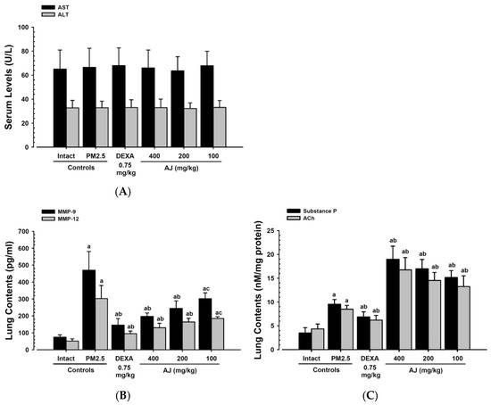 There were no significant changes in AST and ALT levels in the PM2.5 control mice compared to the intact vehicle control mice. Similarly, no significant changes in serum AST and ALT levels were observed in mice treated with DEXA (0.75 mg/kg) or AJ at doses of 400, 200, and 100 mg/kg when compared to the PM2.5 control group under the conditions of this study (Figure 4A). The percentage change in serum AST levels for the PM2.5 control group was 2.15% relative to the intact vehicle control. In comparison, the changes for the DEXA (0.75 mg/kg) and AJ at 400, 200, and 100 mg/kg were 2.26%, −0.75%, −4.36%, and 1.95%, respectively, compared to the PM2.5 control group. The percentage change in serum ALT levels for the PM2.5 control group was 0.31% compared to the intact vehicle control. The changes for the DEXA (0.75 mg/kg) and AJ at 400, 200, and 100 mg/kg were 0.61%, 0.30%, −1.83%, and 0.91%, respectively, compared to the PM2.5 control group.