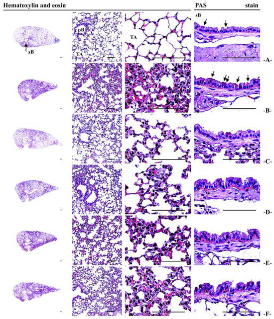 For histopathological examination, approximately equal regions from the left lateral lobe of each lung were trimmed. These sections were re-fixed in 10% neutral buffered formalin for a minimum of 24 h. After fixation, the tissues were processed into paraffin blocks using an automated tissue processor (Shandon Citadel 2000; Thermo Scientific, Waltham, MA, USA) and embedded with an embedding center (Shandon Histostar, Thermo Scientific, Waltham, MA, USA). Sections with a thickness of 3 to 4 μm were stained with hematoxylin and eosin (H&E) for general histopathological evaluation and with Periodic A Acid–Schiff (PAS) stain for identifying mucus-producing goblet cells, following well-reported protocols [20,33,34]. The histological profiles were examined under a light microscope (Model Eclipse 80i; Nikon, Tokyo, Japan). Observers were blinded to group distribution during analysis.