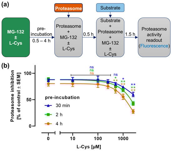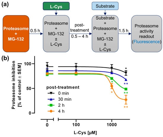 Partial reactivation of the MG-132-inhibited proteasome by L-cysteine. A cell-free proteasome inhibition assay was used as in Figure 1. (a) Treatment scheme: MG-132 (1 µM) was pre-incubated with the isolated proteasome for 30 min to allow for inhibition to occur. Then, L-cysteine (L-Cys) was added and incubated for the indicated time spans to allow a potential reactivation of the proteasome. Finally, substrate (Suc-LLVY-AMC) was added for 90 min before measurement of fluorescence. (b) The proteasome inhibition was quantified for reactivation times (post-treatment) with L-Cys for 1–4 h. Data were normalized to full proteasome activity (no MG-132) in the presence of the respective L-Cys concentrations. Data are means ± SEM, n = 3. For statistical analysis, the L-Cys-co-treated samples were compared to the control samples treated only with MG-132, using a 2-way ANOVA followed by Dunnett’s multiple comparisons post hoc test (*: p < 0.05; **: p < 0.001).