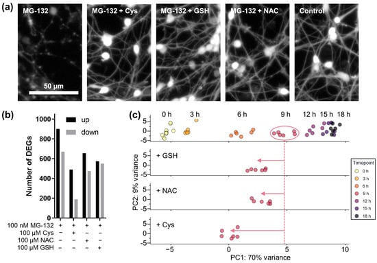 To investigate the status of treated cells in greater detail, we used a transcriptome analysis, as such an endpoint may indicate whether the direct biological effect of MG-132 was blocked within the live cells. We reasoned that the inactivation of MG-132 by thiols would not only increase neuronal viability but should also blunt cell stress responses triggered by proteasome inhibition. First, transcriptome de-regulation by MG-132 was recorded as the reference data set. Reference data on neurons treated with MG-132 alone were obtained as described [33]: LUHMES neurons were treated with MG-132 for 3 to 18 h. A principal component analysis (PCA) of the transcriptome data revealed a time-dependent deregulation of genes (Figure 2c). A quantification of the number of genes de-regulated by MG-132 alone is given in Figure S3a. Since cell death starts at 10–12 h [1], we expected that the samples taken after that time point would not be useful to show the effects of the thiols on non-dead cells. Therefore, we chose the 9 h time point (after the addition of MG-132) for obtaining the samples with thiol pre-incubation. The transcriptome analysis by PCA revealed that the thiols only had a mild (partial) effect on the transcriptional de-regulation (Figure 2b,c): The pre-incubations with the thiols resulted in a shift along principle component 1 (PC1) in the PCA plot. This means that they delayed the effects of MG-132. NAC and GSH caused a delay of about 2 h and L-Cys of about 4 h (when compared to 9 h samples treated with MG-132 alone). Notably, the thiols (L-Cys, GSH, and NAC) did not lead to a transcriptome de-regulation on their own (Figure S3b).