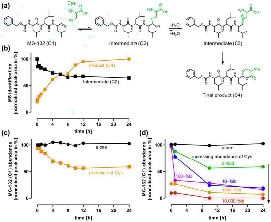 The decline in MG-132 (C1) in the presence of L-Cys was assessed in more detail: within 10 h, about 50% of MG-132 was lost in the presence of 200 µM L-Cys (Figure 3c), while MG-132 alone was stable for 24 h under the same conditions. Increasing the abundance of L-Cys led to a faster depletion of MG-132: 10 mM L-Cys depleted MG-132 to 34% within 1 h. 1000 mM L-Cys completely depleted MG-132 within 10 h (Figure 3d).