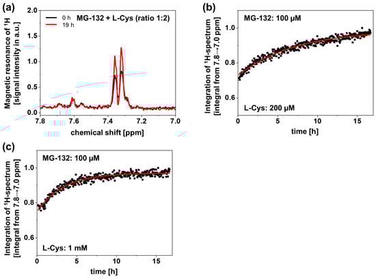 To further quantify the reaction kinetics between MG-132 and L-Cys, nuclear magnetic resonance spectroscopy (NMR) was used. MG-132 (100 µM) and L-Cys were measured in fast intervals over 19 h. A specific window in the 1H-NMR spectrum (7.8–7.0 ppm) was chosen to quantify the reaction kinetics. The signal of MG-132 incubated alone did not change within the relevant timespan (Figure S7a). L-Cys (200 µM) had no signal in this interval (Figure S7b). The addition of L-Cys to MG-132 did not immediately change the signal either (Figure S7c); however, after 19 h of co-incubation, the signal changed significantly (Figure 4a). To properly quantify the reaction kinetics, the chosen interval was integrated at many time points (0–19 h), and the data points were fitted to an exponential function to determine the time constant of the reaction. The reaction was more than twice as fast with 1 mM L-Cys (Figure 4c) compared to 200 µM L-Cys (Figure 4b) (time constants of 3 h−1 vs. 7 h−1). These results confirm that a concentration- and time-dependent covalent reaction may occur between MG-132 and L-Cys at high L-Cys concentrations.