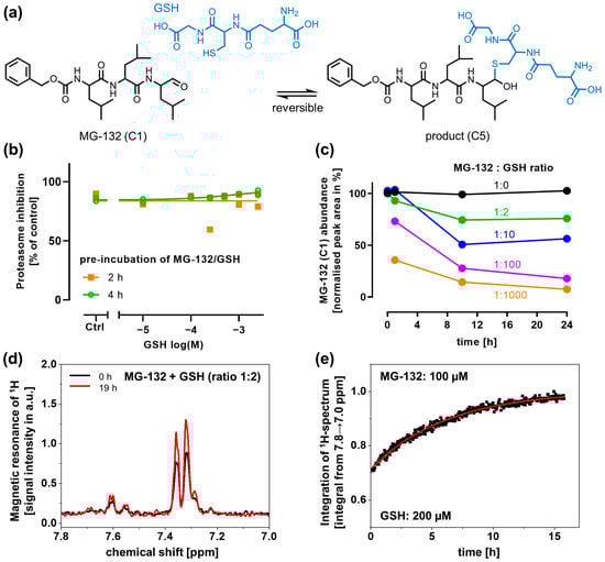 To confirm the chemical reaction and to obtain an insight into its kinetics, 1H-NMR measurements were performed. MG-132 (100 µM) and GSH were incubated over 19 h. GSH alone had no signal (in the quantified window; Figure S9a). It also had no immediate effect on the MG-132 signal (Figure S9b). After 19 h of co-incubation, the MG-132 signal changed significantly (Figure 5d). This change was quantified over time, and data were fitted to an exponential function (Figure 5e). The time constant (6 h−1) was similar to the one observed with L-Cys (7 h−1).