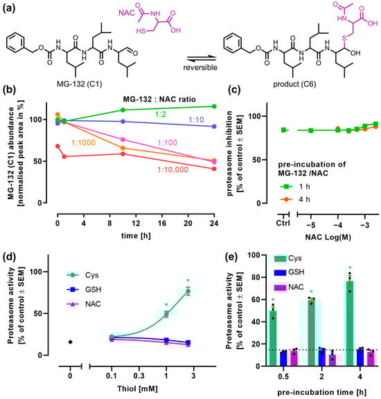 Therefore, we aimed here to determine whether MG-132 reacts covalently with thiols (Cys, GSH, and NAC) relevant for cell culture experiments, whether this reaction could occur under physiological conditions, and whether it may impact cell culture experiments during thiol intervention studies.