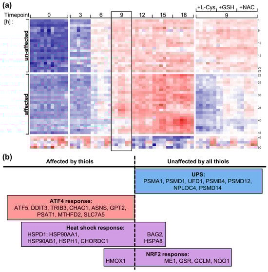 Differential effects of thiols on gene expression changes by MG-132. Differentiated LUHMES cells (d6) were incubated for 0–19 h with MG-132 (100 nM), as described in Figure 2 and Figure S10. The 9 h samples were in the presence or absence of thiols (100 µM; L-Cys: L-cysteine, GSH: glutathione, NAC: N-acetyl-cysteine). (a) The top 50 differentially expressed genes (DEGs) were identified. The color code indicates the row-wise z-score (full red: 1; white: 0; full blue: −2). The gene names (selected row numbers for orientation) are as follows, from top to bottom: ME1 (1), GSR, GCLM, NQO1, PSMA1 (5), PSMD1, UFD1, PSMB4, PSMD12, NPLOC4 (10), PSMD14, ANP32E, PLAA, PALM3, SCPEP1 (15), BRF2, XPOT, VCP, CYB5R1, BAG2 (20), HSPA8 (21), HMOX1 (22), HSPD1, HSP90AA1, HSP90AB1 (25), HSPH1, CHORDC1, IARS1, GARS1, ATF5 (30), DDIT3, TRIB3, CHAC1, ASNS, GPT2 (35), PSAT1, MTHFD2, SLC7A5, SLC3A2, FLNC (40), TNFRSF10B, PPP1R15A, CBS, CBX4, ZFAND2A (45), PEG10, PCP4, MYH3, NEFM, ABRACL (50). The genes were classified as “affected” or “un-affected” by thiols, depending on whether the co-treatment with thiols significantly reverted the MG-132-induced deregulation (box) towards the untreated expression level. (b) Most of the genes from (a) fall into 4 groups: ubiquitin–proteasome system (UPS), ATF4 response, heat shock response, NRF2 response. Gene groups unaffected by thiols are given in blue boxes, gene groups fully affected by thiols are given in red boxes, gene groups partially affected by thiols are given in purple boxes. The proteasome is still inhibited in the presence of thiols, which is indicated by the UPS and NRF2 response also being (mostly) unaffected by thiols. Downstream damage pathways (ATF4 and heat shock response) are, however, attenuated by thiols, which explains the rescuing effect seen morphologically (Figure 2).