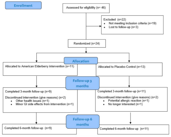 - Curtis, A.F.; Musich, M.; Costa, A.N.; Gonzales, J.; Gonzales, H.; Ferguson, B.J.; Kille, B.; Thomas, A.L.; Wei, X.; Liu, P.; et al. Feasibility and Preliminary Efficacy of American Elderberry Juice for Improving Cognition and Inflammation in Patients with Mild Cognitive Impairment. Int. J. Mol. Sci. 2024, 25, 4352. [Google Scholar] [CrossRef] [PubMed]