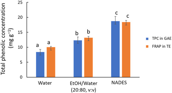 Recovery of phenolic compounds from olive leaves using water, ethanol/water mixture (20:80 v/v), and ChCl/Gly NADES (1:5 m/m, 30% water) using MAE as an extraction technique. Blue bars, TPC values by HPLC-UV in mg GAE g−1; orange bars, antioxidant capacity values by FRAP in mg TE g−1. Comparing TPC or TE values, different letters mean significant differences and vice versa.
