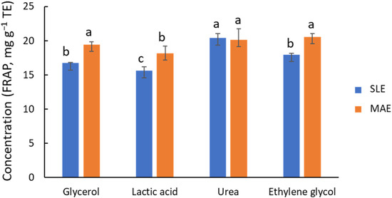 Based on their promising performance in similar studies [2,22], the extraction efficiency of four NADES, composed of ChCl with Gly, Lac, urea, or EG as donors, was compared using a 1:5 ChCl-to-donor ratio and 30% water. In addition to the MAE technique (10 min at 80 °C), conventional solid–liquid extraction (SLE) with mechanical stirring (2 h at 80 °C) was also considered. The outcomes of global antioxidant capacity by FRAP (Figure 2) indicate that Gly, EG, and urea provide high activities, ca. 15 to 20 mg g−1 TE, with urea possibly being the most effective donor. In contrast, Lac was found to be a less effective agent. The behavior of Gly and EG is similar, in line with the structural and functional similarity of these two molecules. Except for the ChCl/urea system, Figure 2 shows that MAE provides FRAP values for global antioxidant capacity that are ca. 20% higher than those of SLE. However, there are noticeable differences in process time (2 h for SLE vs. 10 min for MAE). It is important to note that shorter process times in SLE provided significantly lower extraction yields (Figure S3). Chanioti et al. [24,30] compared MAE, SLE, UAE, and high hydrostatic pressure extraction, and found that SLE provided the highest extraction efficiency for recovering phenolic compounds from olive pomace matrix. In that study, the authors selected ChCl/citric acid (1:2) with 20% of water or ChCl/caffeic acid (1:2), 60 °C, and 30 min of extraction time as the working conditions.