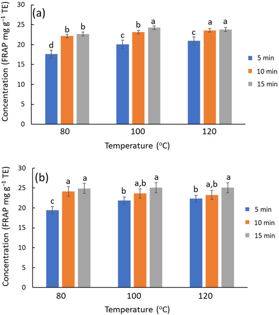 Influence of time and temperature on the recovery of phenolic compounds from olive leaves using MAE, estimated by FRAP. (a) ChCl/Gly, (b) ChCl/urea. For each NADES system, different letters mean significant differences and vice versa.