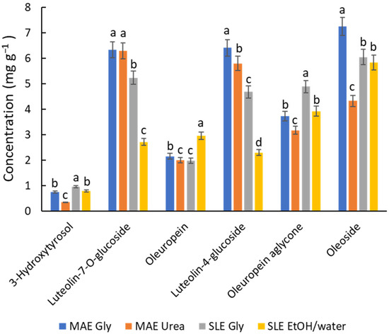 In light of all the previous results, a final study was carried out to compare the options considered most relevant for various reasons. The selected conditions include MAE (80 °C, 10 min) with Gly and urea NADES, and SLE (80 °C, 2 h) with Gly NADES and an ethanol/water mixture. Figure 4 shows the profiling of the most quantitatively significant polyphenols, such as 3-hydroxytyrosol, luteolin-7-O-glucoside, oleuropein, luteolin-4-glucoside, oleuropein aglycone, and oleoside, which were found at concentrations above 1 mg g−1 in the sample, representing ca. 90% of the total polyphenols. On the whole, the MAE/NADES Gly system provides better recoveries for flavonoids; this finding is in accordance with the results of Gao et al. [31] dealing with the flavonoid extraction (rutin, isoquercetin, astragalin) from Mulberry leaves using MAE (ChCl/Gly (1:2) with 20% of water). When comparing the performance of SLE and MAE (Figure 4), MAE is generally superior. However, SLE with either ChCl/Gly NADES or the hydroalcoholic mixture (20% EtOH) is more suitable for hydroxytyrosol derivatives (e.g., 3-hydroxytyrosol and oleuropein). This outcome is in line with Boli et al. [18], who showed that ethanol is an effective solvent for oleuropein recovery from olive leaves by SLE, particularly at high temperatures (70 °C). For compounds occurring at concentrations below 0.5 mg g−1, such as rutin, coumaric acid, and luteolin, the general behavior seems more complex, and their extraction yield may depend on unknown affinity issues. Overall, since the quantitative differences between the options are not remarkable, it suggests that all approaches are viable. The choice between them will depend on the specific applications of the extracts and the scaling requirements.