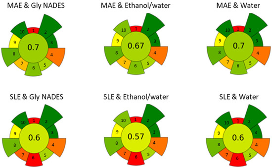 Finally, a greenness assessment of the different approaches was conducted to evaluate the sustainability of the extraction process. The AGREEprep calculator [28], which assigns a so-called normalized AGREE score based on the principles of green chemistry, was used. The score ranges from 0 to 1, with values closer to 1 indicating a greener process. Both MAE and SLE techniques were evaluated using water, 20% ethanol, and ChCl/Gly as the solvents. For all solvents tested, the AGREE score for MAE was consistently higher (0.74, 0.71, 0.74) compared to the corresponding SLE system (0.63, 0.60, 0.63) (see Figure 6). The main reason for the difference in scores between the two extraction techniques is the sample throughput, with MAE being more versatile than SLE. The lower scores observed for the ethanol/water system, whether using MAE or SLE, are mostly linked to operator safety concerns. This assessment was performed on a laboratory scale, and factors like sample throughput may differ when considering upscaling.