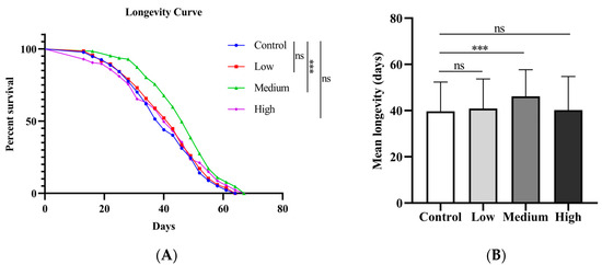 Effects of SIL on longevity. (A) Survival curves and (B) average lifespans of Drosophila melanogaster treated with different concentrations of SIL (150 flies were used in each group). Low, medium, and high refer to 0.6 mg/mL, 1.2 mg/mL, and 2.4 mg/mL of SIL, respectively. ns represents not significant; *** p < 0.001.
