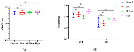Effects of SIL on intestinal integrity. (A) Non-Smurf and Smurf flies. (B) The proportions of Smurf flies treated with different concentrations of SIL at days 20 and 40. In the dot plot, each dot represents the value of an independent experiment (including 100 fruit flies). Low, medium, and high refer to 0.6 mg/mL, 1.2 mg/mL, and 2.4 mg/mL of SIL, respectively. ns represents not significant; * p < 0.05.