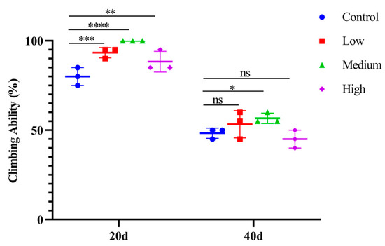 The climbing ability of fruit flies treated with different concentrations of SIL at days 20 and 40. In the dot plot, each dot represents the value of an independent experiment (including 20 fruit flies). Low, medium, and high refer to 0.6 mg/mL, 1.2 mg/mL, and 2.4 mg/mL of SIL, respectively. ns represents not significant; * p < 0.05; ** p < 0.01; *** p < 0.001; **** p < 0.0001.