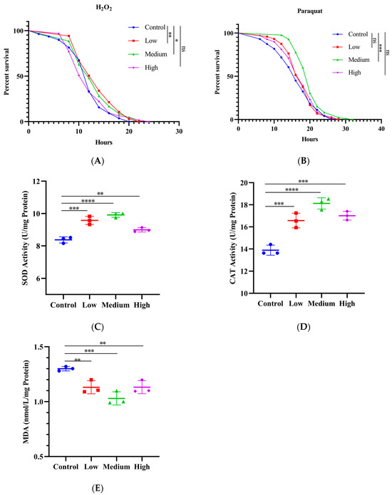 Effects of SIL on antioxidant ability in fruit flies. Survival curves of flies treated with SIL under H2O2-induced (A) and paraquat-induced (B) oxidative stress (100 flies were used in each group). (C) The SOD activity, (D) CAT activity, and (E) MDA content of flies treated with different concentrations of SIL for 40 days. In the dot plot, each dot represents the value of an independent experiment (including 30 fruit flies). Low, medium, and high refer to 0.6 mg/mL, 1.2 mg/mL, and 2.4 mg/mL of SIL, respectively. ns represents not significant; * p < 0.05; ** p < 0.01; *** p < 0.001; **** p < 0.0001.