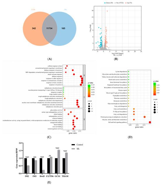 Effects of SIL on gene expression in 30-day-old fruit flies. (A) Venn diagram and (B) volcano plots containing the number of differentially expressed genes between the flies treated with or without SIL. (C) GO and (D) KEGG pathway analysis of differentially expressed genes between the flies treated with or without SIL. (E) Validation of six differentially expressed genes using qRT-PCR (the assay was repeated 3 times across different replicates, 10 flies were used for each time). ** p < 0.01; *** p < 0.001; **** p < 0.0001.