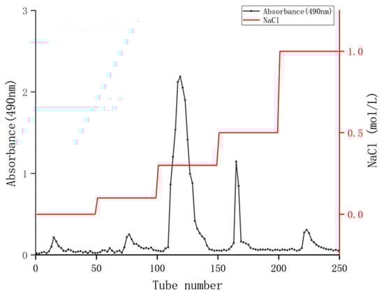 A measure of 0.120 g of the crude coriander polysaccharides was weighted and dissolved in 40 mL distilled water, followed by centrifugation at 5581 g/min for 10 min. The supernatant was collected and filtered through a 0.22 μm aqueous microporous membrane. Using a Q SepharoseTM Fast Flow column (2.5 × 60 cm), gradient elution was performed sequentially with NaCl solution ranging from 0 to 1.0 mol/L. The flow rate was controlled at 1.0 mL/min using a DHL-2 computer constant flow pump (Shanghai Jingke Co., Ltd., Shanghai, China), with 10 mL collected in each tube and 50 tubes collected in each gradient. The phenol sulfuric acid method was used for tracking and detection, and the elution curve was plotted [31,32]. The main components were collected for dialysis, concentration and freeze-drying, and the coriander polysaccharides were obtained (abbreviated as CSPs).