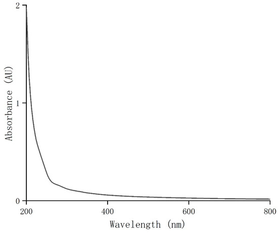 UV full-wavelength scanning was performed on the purified coriander polysaccharides (CSPs) at 200–800 nm. The result showed that CSPs had weak UV absorption around 260 nm and 280 nm (Figure 2). Combined with the results of the total sugar and protein contents, this indicated that the purified coriander polysaccharides did not contain or contained very few impurities, proteins or peptides, indicating a high purity of CSPs in this work.