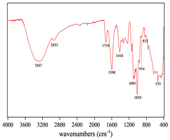 FT-IR can reflect the type of functional groups in compounds, so the structure of CSPs could be inferred from Figure 3. The broad and intense peak at 3267 cm−1 was attributed to O-H stretching vibration, indicating that the tested sample was a polysaccharide substance [38]. The peak at 1734 cm−1 was attributed to the stretching vibration of C=O, a characteristic of carboxylic acid esters, indicating that CSPs might be an acidic polysaccharide [27]. The absorption peak at 1418 cm−1 was attributed to stretching and bending vibrations of C-H, while that at 1598 cm−1 was attributed to C=O asymmetric stretching vibration, suggesting the existence of uronic acid in CSPs [39]. The peak at 1010 cm−1 indicated the presence of the pyran rings in CSPs. The characteristic absorption peaks at 914 cm−1 and 833 cm−1 indicated the presence of β-glycosidic and α-glycosidic bonds, respectively [33]. FT-IR results suggested that CSPs might be acidic heteropolysaccharides containing pyran rings, α- and β-glycosidic bonds and glucuronic acid, bearing similarity to the polysaccharides from coriander seeds or fresh coriander [19,20].