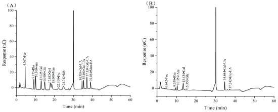 The samples were analyzed on an ICS 5000+ ion chromatography system (Thermo Fisher Scientific Co., Ltd., Shanghai, China) with an electrochemical detector and a DionexTM CarboPacTM PA20 column (150 mm × 3.0 mm, 10 μm) (Thermo Fisher Scientific Co., Ltd., Shanghai, China). The mobile phase was a mixture of A (pure water), B (0.1 M NaOH) and C (0.2 M NaAc). The elution gradient was set as follows: 0 min A/B/C (95:5:0, v/v), 26 min A/B/C (85:5:10, v/v), 42 min A/B/C (85:5:10, v/v), 42.1 min A/B/C (60:0:40, v/v), 52 min A/B/C (60:40:0, v/v), 52.1 min A/B/C (95:5:0, v/v), and 60 min A/B/C (95:5:0, v/v). The flow rate was 0.5 mL/min, and the column temperature was maintained at 30 °C.