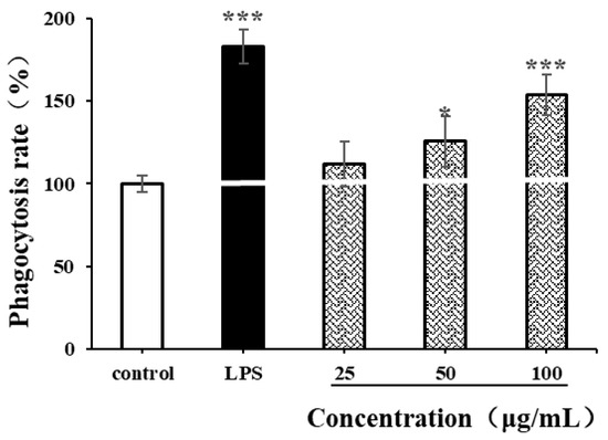 Effects of CSPs on phagocytosis of RAW264.7 cells. Compared with the negative control group, * represents p < 0.05 and *** represents p < 0.001.