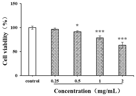 Natural polysaccharides are reported to have strong anti-cancer activity due to the free radical scavenging capacity and inhibition capacity of tumor cells [41]. The liver cancer cell HepG2 was used in the current study to evaluate the in vitro anticancer activity of CSPs (Figure 10). After 24 h of treatment with CSPs, the proliferation ability of HepG2 cells gradually weakened with the increase in concentration and showed significant differences within the concentration range of 0.5–2 mg/mL. The inhibition rates of CSPs at 0.5, 1 and 2 mg/mL were 90.9, 78.2 and 63.6%, respectively. When the concentration exceeded 1.0 mg/mL, the inhibition of HepG2 cell viability became more significant (p < 0.001). Treated with the dandelion leaf polysaccharides, at a dose of 1 mg/mL, the HepG2 cell showed a cell viability of 29.4% [28], indicating a stronger potential than CSPs to inhibit the proliferation of HepG2 cells. The mechanism by which CSPs inhibited HepG2 cell viability might be similar to that of dandelion leaf polysaccharides, which induce cell apoptosis, indicating their potential as anticancer agents [28].