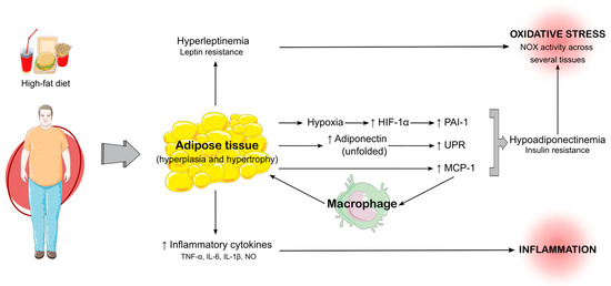 Mechanisms linking high-fat diet to adipose tissue expansion and systemic effects of inflammation and oxidative stress. A high-fat diet leads to hyperplasia and hypertrophy of adipose tissue. This expansion contributes to hyperleptinemia and leptin resistance. Enlarged adipose tissue experiences hypoxia, which activates hypoxia-inducible factor 1-alpha (HIF-1α) and increases plasminogen activator inhibitor-1 (PAI-1). Additionally, unfolded adiponectin triggers the unfolded protein response (UPR), especially the PERK (protein kinase R-like ER kinase) and IRE1 (inositol-requiring enzyme 1) pathways, responsible for the degradation of misfolded adiponectin and consequent hypoadiponectinemia and insulin resistance. Macrophages infiltrate the adipose tissue Adipose tissue also synthesizes monocyte chemoattractant protein-1 (MCP-1), which disturbs insulin signaling by disrupting Akt phosphorylation. MCP-1 contributes to inflammation by secreting inflammatory cytokines such as Tumor Necrosis Factor-alpha (TNF-α), Interleukin-6 (IL-6), Interleukin-1β (IL-1β), and nitric oxide (NO). Inflammatory and oxidative stress markers, including NADPH oxidase (NOX) activity, exacerbate systemic inflammation and oxidative stress. Together, these pathways contribute to dysfunctions associated with metabolic syndrome. ↑—upregulation.