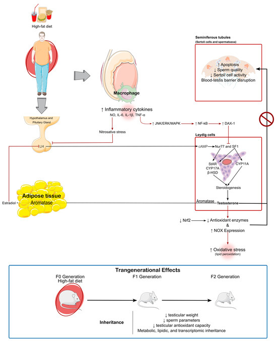 High-fat-diet-induced testicular dysfunction and its transgenerational effects. A high-fat diet induces adipose tissue hypertrophy and aromatase activity, increasing estradiol levels. Nitric oxide (NO) released by macrophages and adipose tissue contributes to nitrosative stress, impairing the hypothalamus–pituitary axis and disrupting LH signaling. Other inflammatory cytokines, such as Tumor Necrosis Factor-alpha (TNF-α), Interleukin-6 (IL-6), Interleukin-1β (IL-1β), exacerbate inflammation, further impairing Leydig cell function. Leydig cells exhibit reduced steroidogenic activity due to the activation of the JNK/ERK/MAPK pathway that culminates in the increased Nuclear Factor Kappa B (NF-κB) and DAX-1, which inhibits Nur77 and steroidogenic factor 1 (SF1), transcription factors involved in the expression of steroidogenic enzymes (steroidogenic acute regulatory protein—StAR; Cytochromes P450 CYP11a and CYP17a; and β-Hydroxysteroid dehydrogenases—β-HSD, resulting in decreased testosterone production. The seminiferous tubules show increased apoptosis, disrupted Sertoli cell activity, and compromised blood–testis barrier integrity, contributing to poor sperm quality. Elevated oxidative stress, driven by reduced nuclear factor erythroid 2-related factor 2 (Nrf2)-mediated antioxidant defenses and increased NADPH oxidase (NOX) activity, exacerbates lipid peroxidation and testicular damage. Transgenerational effects observed in the F1 and F2 generations include reduced testicular weight, decreased sperm parameters, and impaired antioxidant capacity, accompanied by metabolic, lipidic, and transcriptomic inheritance. Red arrows represent the negative effects induced (regular arrow—effect induced; inhibition arrow—process inhibition). ↓—downregulation. ↑—upregulation. Red box—negative effects. Blue box—transgenerational effects.