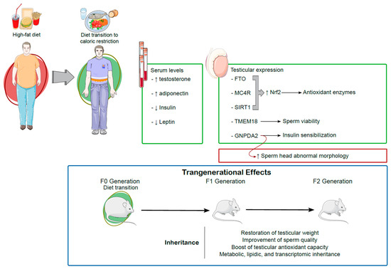 Effects of dietary transition from a high-fat diet to caloric restriction on male reproductive health and transgenerational outcomes. Transitioning from a high-fat diet to caloric restriction leads to improvements in serum markers, including increased testosterone and adiponectin levels, and reduced insulin and leptin levels. In the testes, enhanced expression of key genes—fat mass and obesity-associated protein (FTO), melanocortin 4 receptor (MC4R), sirtuin 1 (SIRT1), glucosamine-6-phosphate deaminase 2 (GNPDA2), transmembrane protein 18 (TMEM18)—promotes antioxidant enzyme activity (via Nrf2), sperm viability, and insulin sensitization. However, caloric restriction is associated with an increase in abnormal sperm head morphology. Transgenerational benefits observed in the F1 and F2 generations include restored testicular weight, improved sperm quality, increased testicular antioxidant capacity, and enhanced metabolic, lipidic, and transcriptomic profiles, suggesting intergenerational inheritance of positive dietary effects. ↓—decrease. ↑—increase. Green box—positive effects. Red box—negative effects. Blue box—transgenerational effects.