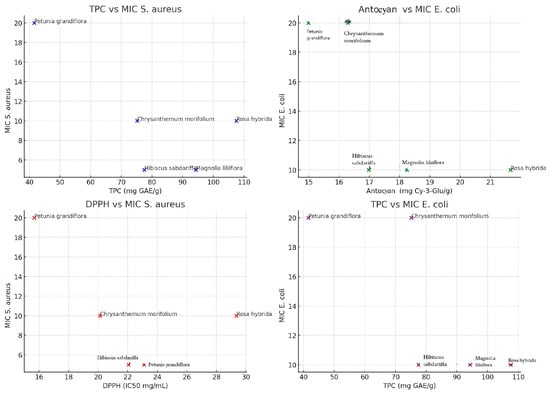 Following the relationship between antioxidant activity (DPPH, ABTS, FRAP) and MIC, it can be observed that extracts with lower DPPH values (greater antioxidant efficiency) tend to have more antibacterial effect. For example, R. hybrida and M. liliiflora exhibit superior antioxidant and antibacterial activity. Higher values of antioxidant activity (μmol TE/g) coincide with better antibacterial activity, especially in R. hybrida (ABTS: 49.89 μmol TE/g; FRAP: 48.68 μmol TE/g), while extracts with low antioxidant activity (P. grandiflora) also had reduced antibacterial efficiency. The correlation between these aspects leads to the hypothesis that antioxidant activity plays a role in antibacterial activity, through the generation of reactive oxygen species that can affect the bacterial cell wall. This analysis also reveals some discrepancies and exceptions: C. morifolium has relatively good TPC and anthocyanin content, but moderate antibacterial efficiency, suggesting that other bioactive compounds may influence the results. H. sabdariffa has TPC and anthocyanins comparable to R. hybrida, yet its antibacterial efficiency is lower, indicating a possible difference in specific chemical composition or weaker synergies between antioxidants. From this analysis, direct correlations can be established: TPC and anthocyanins strongly correlate with antibacterial efficiency against Gram-positive (S. aureus) and Gram-negative bacteria (E. coli), and antioxidant activity (ABTS and FRAP) further contributes to antibacterial activity.