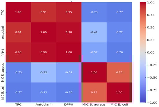In this case, it can be stated that negative correlations are present where the negative values of the coefficients suggest that a higher content of polyphenols, anthocyanins, and antioxidant activity is associated with lower MIC values (better antibacterial activity); none of the correlations are statistically significant (p > 0.05), which indicates a possible insufficiency of data (small number of observations).