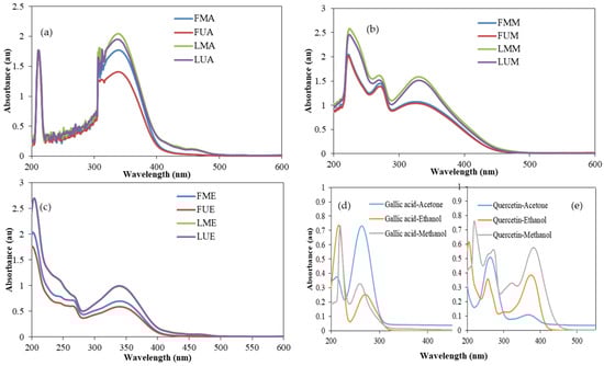 UV–VIS spectra of the flower and leaf extracts of Polygala major Jacq. using different methods and solvents. (a) acetone extracts; (b) ethanol extracts; (c) methanol extracts; (d) gallic acid standard; (e) quercetin standard. (FMA: Flower macerated with acetone; FUA: Flower ultrasonicated with acetone; LMA: Leaf macerated with acetone; LUA: Leaf ultrasonicated with acetone; FME: Flower macerated with ethanol; FUE: Flower ultrasonicated with ethanol; LME: Leaf macerated with ethanol; LUE: Leaf ultrasonicated with ethanol; FMM: Flower macerated with methanol; FUM: Flower ultrasonicated with methanol; LMM: Leaf macerated with methanol; LUM; Leaf ultrasonicated with methanol).