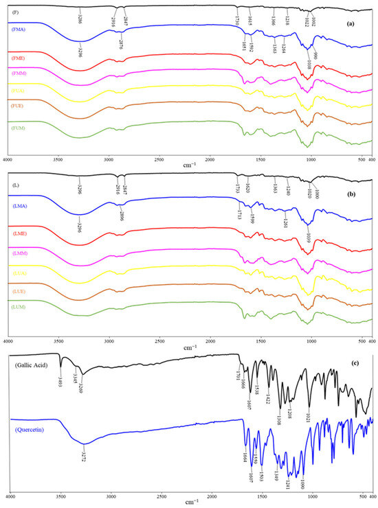 FTIR spectra of the flower and leaf extracts of Polygala major Jacq. using different methods and solvents. (a) raw flower, macerated flower extracts, and ultrasonicated flower extracts; (b) raw leaf, macerated leaf extracts, and ultrasonicated leaf extracts; (c) gallic acid and quercetin standards. (FMA: Flower macerated with acetone; FUA: Flower ultrasonicated with acetone; LMA: Leaf macerated with acetone; LUA: Leaf ultrasonicated with acetone; FME: Flower macerated with ethanol; FUE: Flower ultrasonicated with ethanol; LME: Leaf macerated with ethanol; LUE: Leaf ultrasonicated with ethanol; FMM: Flower macerated with methanol; FUM: Flower ultrasonicated with methanol; LMM: Leaf macerated with methanol; LUM; Leaf ultrasonicated with methanol).