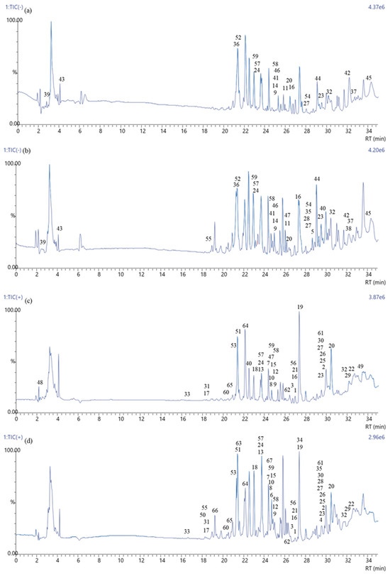 LC–MS chromatograms of Polygala major Jacq. extracts. (a) negative ion chromatogram of the flower extract, (b) negative ion chromatogram of the leaf extract, (c) positive ion chromatogram of the flower extract, (d) positive ion chromatogram of the leaf extract.