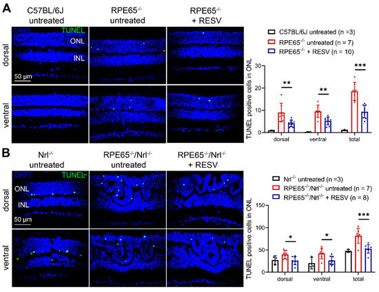 We then examined the effects of resveratrol on photoreceptor apoptosis in Rpe65-deficient mice. Mother Rpe65−/− and Rpe65−/−/Nrl−/− mice received resveratrol (120 µg/mL in drinking) or vehicle for 20 days and 10–13 days, respectively, beginning on the day when the pups were at P5, and pups were then evaluated for photoreceptor apoptosis. The number of TUNEL-positive cells in Rpe65−/− and Rpe65−/−/Nrl−/− mice was significantly higher than that in their respective controls (Figure 6). Treatment with resveratrol reduced this number by about 50% in Rpe65−/− mice (Figure 6A) and about 45% in Rpe65−/−/Nrl−/− mice (Figure 6B) compared with their respective untreated controls.