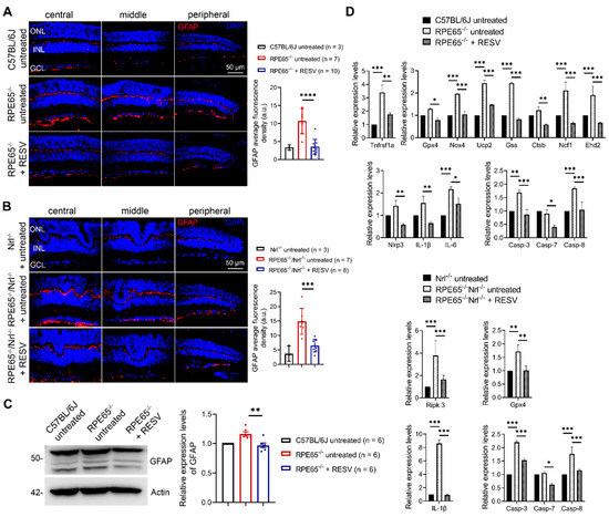 We further examined the effects of resveratrol on the retinal stress response/macroglial cell activation in Rpe65-deficient mice. Mother Rpe65−/− and Rpe65−/−/Nrl−/− mice received resveratrol (120 µg/mL in drinking water) or vehicle for 20 days and 10–13 days, respectively, beginning on the day when the pups were at P5, and pups were then evaluated for GFAP expression by immunofluorescence labeling and immunoblotting. The fluorescence density of GFAP in Rpe65−/− and Rpe65−/−/Nrl−/− mice was greatly increased compared with their respective controls (Figure 7A,B). Treatment with resveratrol completely abolished the elevation in Rpe65−/− mice (Figure 7A) and greatly diminished the elevation in Rpe65−/−/Nrl−/− mice (Figure 7B) compared with their respective untreated controls. Consistent with the findings in GFAP labeling, immunoblotting of GFAP using retinal protein extracts showed that the level of GFAP was significantly increased in Rpe65−/− mice compared with wild-type (C57BL/6) controls, and treatment with resveratrol abolished this elevation (Figure 7C). We also examined the effects of resveratrol on the expression of genes involved in cell death, oxidative stress, and inflammation. Several genes regulating oxidative stress (Nox4, Ucp2, Gss, Ctsb, Ehd2), cell death (Tnfrsf1α, Ripk3, Casp-3, Casp-8), and inflammation (Nirp3, Il-6, Il-1β) were significantly elevated in Rpe65−/− and Rpe65−/−/Nrl−/− mice, whereas treatment with resveratrol inhibited these elevations (Figure 7D).