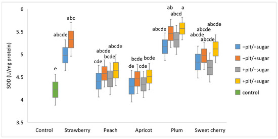 Boxplot of superoxide dismutase—SOD (U/mg protein) values (mean ± SD) measured in different types of fruit wines produced with or without pits (+pit; −pit) and with or without added sugar (+sugar; −sugar). a–e: Different lowercase letters indicate the significant difference between groups, which was confirmed by the ANOVA post hoc Tukey test (p < 0.05).
