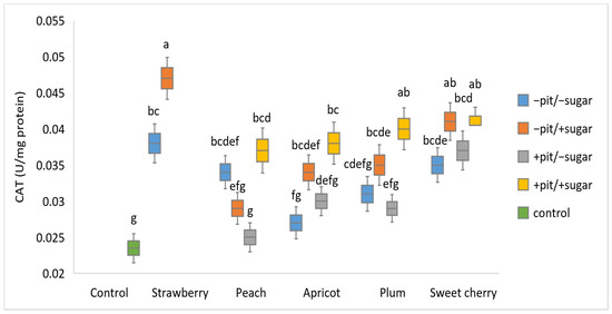 Boxplot of catalase—CAT (U/mg protein) values (mean ± SD) measured in different types of fruit wines produced with or without pit (+pit; −pit) and with or without added sugar (+sugar; −sugar). a–g: Different lowercase letters indicate the significant difference between the groups, confirmed by the ANOVA post hoc Tukey test (p < 0.05).