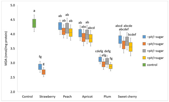 Boxplot of malondialdehyde—MDA values (nmol/mg protein) (mean ± SD) measured in different types of fruit wines produced with or without pits (+pit; −pit) and with or without added sugar (+sugar; −sugar). a–g: Different lowercase letters indicate the significant difference between groups confirmed by the ANOVA post hoc Tukey test (p < 0.05).