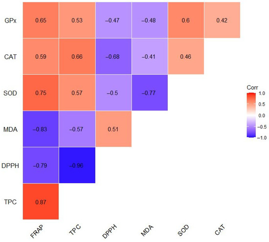 Graphical representation of the correlation heat map between the oxidative stress parameters (SOD, CAT, GPx, and MDA) and the antioxidant properties (FRAP, TPC, and DPPH). Red indicates positive and blue represents negative correlation coefficients. All correlation coefficients are statistically significant at the level of 0.05. SOD—superoxide dismutase, CAT—catalase, GPx—glutathione peroxidase, MDA—malondialdehyde, FRAP—ferric reducing ability of plasma, TPC—total phenolic content, DPPH—2,2-diphenyl-1-picrylhydrazyl.
