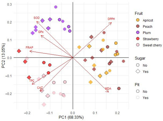 Biplot from the principal component analysis. The arrows represent the loadings of the variables they represent, and the dots represent the values of the principal components for the different types of fruit wines shown along the first two components. The types of fruit wine are represented by different colors. Square and circular shapes represent the presence or absence of sugar. Light and dark edges of the dots represent the presence or absence of pits. SOD—superoxide dismutase, CAT—catalase, GPx—glutathione peroxidase, MDA—malondialdehyde, FRAP—ferric reducing ability of plasma, TPC—total phenolic content, DPPH—2,2-diphenyl-1-picrylhydrazyl.