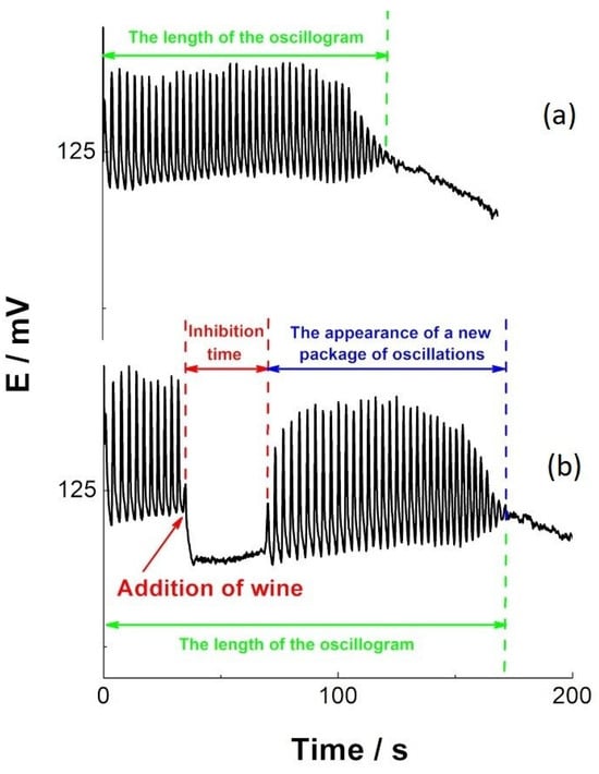 The Briggs–Rauscher (BR) oscillogram without added wine (Figure 8a) showed oscillatory dynamics that started immediately after adding hydrogen peroxide and lasted for 121 ± 10 s. All analyzed fruit wine samples influenced the BR oscillatory dynamics in the same way (Figure 8b). As shown in Figure 8b, the addition of wine (30 s after initiating the oscillatory reaction) immediately stopped the oscillatory behavior of the BR. After this period, called the inhibition time, the response system can develop oscillatory behavior again, and in this case, a new set of oscillations has emerged (Figure 8b).