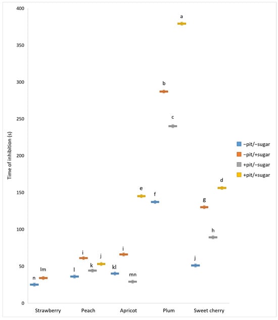 Boxplot of inhibition time (s) values (mean ± SD) measured for different types of fruit wines produced with or without pits and with or without added sugar. a–n: Different lowercase letters indicate the significant difference between the groups, which was confirmed by ANOVA post hoc Tukey test (p < 0.05).