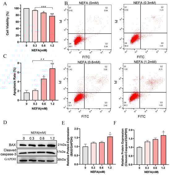 NEFA decreases cell proliferation and induces apoptosis in bEECs. BEECs were exposed to NEFA at the different concentrations (0, 0.3, 0.6, 1.2 mM) for 24 h. (A) Cell viability of bEECs was assessed using the CCK-8 assay. (B) Flow cytometry results illustrating the apoptotic rates of bEECs under various treatment conditions. (C) Quantification was presented by the ratio of apoptotic cells/total cells. (D) Western blot analysis of BAX and cleaved caspase3 in the different treatments. (E) Quantification of normalized protein expression intensity of BAX. (F) Quantification of normalized protein expression intensity of cleaved caspase-3. The experiments were performed in three replicates (n = 3). * p < 0.05, *** p < 0.001 indicate statistically significant differences between the treatment group and the control group;, ## p < 0.01, ### p < 0.001 indicate statistically significant differences between different treatment groups. No marking indicates no significant difference.