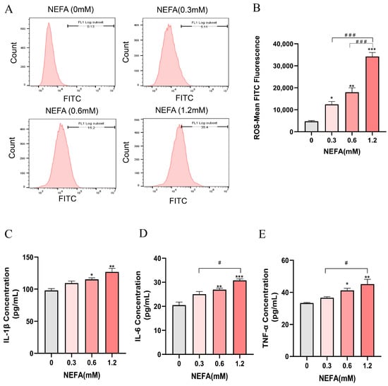 NEFA stimulates ROS accumulation and the release of inflammatory factors in bEECs. BEECs were exposed to NEFA at the different concentrations (0, 0.3, 0.6, 1.2 mM) for 24 h. (A) The level of ROS of bEECs were detected by flow cytometry. (B) Quantification of the level of ROS of bEECs. (C) IL-1β levels in the supernatant of bEECs treated with different concentrations of NEFA. (D) IL-6 levels in the supernatant of bEECs treated with different concentrations of NEFA. (E) TNF-α levels in the supernatant of bEECs treated with different concentrations of NEFA. The experiments were performed in three replicates (n = 3). * p < 0.05, ** p < 0.01, *** p < 0.001 indicate statistically significant differences between the treatment group and the control group; # p < 0.05, ### p < 0.001 indicate statistically significant differences between different treatment groups. No marking indicates no significant difference.