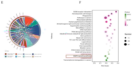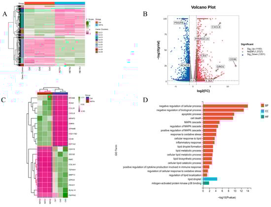 To further investigate the mechanisms behind NEFA-induced apoptosis, lipid accumulation, oxidative stress, and inflammation in bEECs, we next performed RNA sequencing (RNA-seq) analysis on cells after treatment with 1.2 mM NEFA. Heat map representation of these genes shows differential expression between the NEFA group and control group (Figure 4A). Compared to the control group, a total of 2394 DEGs were identified after NEFA treatment, including 1193 upregulated and 1201 downregulated genes (Figure 4B). The top 20 DEGs with the maximal fold changes (up- and downregulated) induced by NEFA are presented in Figure 4C. Several genes from DEGs were selected for RT-qPCR validation analysis, such as CD36, CXCL8, IL-36, GRO1, and PDGFB (Figure S3). A total of 1758 significant GO-BP terms, 154 significant GO-CC terms, and 251 significant GO-MF terms were identified. The significantly enriched GO terms mainly included the apoptotic process, cell death, MAPK cascade, response to oxidative stress, lipid droplet formation, and inflammatory response (Figure 4D). Chord diagrams revealed functional interconnections between multiple key biological processes and critical genes (Figure 4E). The scatter plot of KEGG pathway enrichment analysis revealed that the top 25 enrichment pathways primarily comprised the PI3K-Akt signaling pathway, MAPK signaling pathway, and ECM–receptor interaction (Figure 4F).