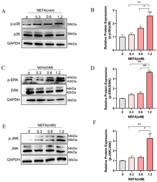NEFA activates MAPK signaling pathway in bEECs. BEECs were exposed to NEFA at different concentrations (0, 0.3, 0.6, 1.2 mM) for 24 h. (A) Ex-pression levels of phosphorylated p38 and p38 in bEECs treated with varying concentrations of NEFA. (B) Quantification of the ratio of p-p38/p38. (C) Expression levels of phosphorylated ERK and ERK in bEECs treated with varying concentrations of NEFA. (D) Quantification of the ratio of p-ERK/ERK. (E) Expression levels of phosphorylated JNK and JNK in bEECs treated with varying concentrations of NEFA. (F) Quantification of the ratio of p-JNK/ JNK. The experiments were performed in three replicates (n = 3). * p < 0.05, ** p < 0.01, *** p < 0.001 indicate statistically significant differences between the treatment group and the control group; # p < 0.05, ## p < 0.01, ### p < 0.001 indicate statistically significant differences between different treatment groups. No marking indicates no significant difference.