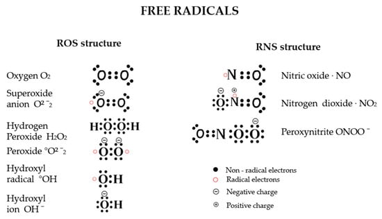 Free radicals are molecules that contain one or more unpaired electrons in their outer shell, causing them to be highly reactive and unstable. Free radicals are generally short-lived and often originate from oxygen and nitrogen [11]. These elements form highly reactive molecules known as reactive oxygen species (ROS) and reactive nitrogen species (RNS). ROS include superoxide anion radicals (O2−•), reactive hydroxyl radicals (OH•), hydroperoxyl radicals (HO2•), as well as other compounds like hydrogen peroxide (H2O2), hypochlorous acid (HOCl), and singlet oxygen (Figure 2) [12]. These molecules capture electrons from nearby molecules to stabilize themselves, which turns the nearby molecules into free radicals and initiates a chain reaction that can cause significant damage to cells and tissue. Free radicals can be generated in the body through enzymatic and non-enzymatic reactions (endogenous sources) or introduced from external sources (exogenous) such as pollution, smoking, and radiation [13]. Reactive oxygen species (ROS), including superoxide anions (O2−), hydroxyl radicals (OH−), and nitrogen-based radicals like nitric oxide (NO), are particularly harmful when their production exceeds the body’s antioxidant defenses [14]. Figure 2 demonstrates the structure of free radicals.
