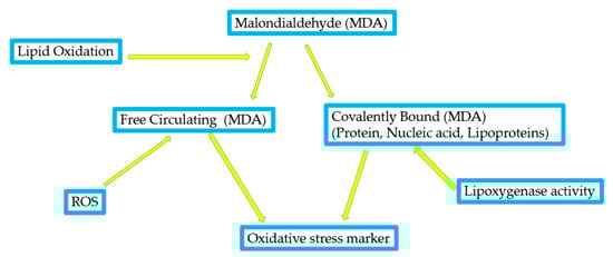 The involvement of reactive oxygen species (ROS) and lipoxygenase activity in lipid peroxidation and the formation of MDA involving free circulating MDA or covalently bound to proteins, nucleic acids, or lipoproteins during oxidative damage MDA is shown as a biomarker of oxidative stress linked with lipid oxidation [29,30].