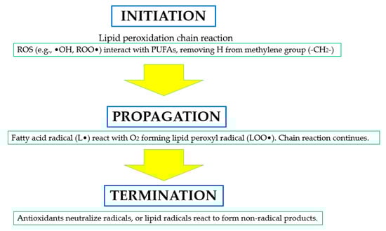 The three stages of lipid peroxidation, a critical oxidative process affecting polyunsaturated fatty acids (PUFAs) in biological membranes. During the initiation phase, reactive oxygen species (ROS), such as hydroxyl radicals (•OH) or peroxyl radicals (ROO•), abstract a hydrogen atom from the methylene group (-CH2-) in PUFAs, generating lipid radicals (L•). In the propagation phase, these lipid radicals react with molecular oxygen (O2), forming lipid peroxyl radicals (LOO•), propagating further chain reactions and amplifying oxidative damage. The termination phase involves neutralizing these radicals with antioxidants or forming non-radical products, halting the chain reaction [32,33,34].